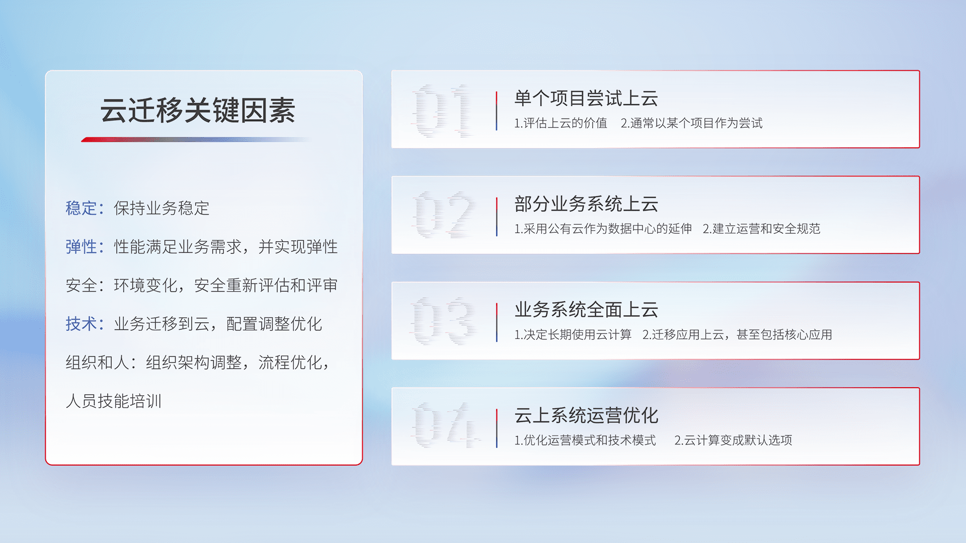 结合实际业务,,,从规划设计、、、、云平台选型、、云原生改造、、数据迁移、、集成交付,,迁移全过程为客户识别最佳上云路径,,,做好风险识别管理,,,,设计网络架构、、身份权限、、、、安全审计合规、、操作审计、、、日志审计、、、、监控告警策略、、多站点容灾设计等,,对云上基础设施进行整体规划,,提升IT治理水平,,,,以满足弹性、、、、高可用、、高性能的需求。。。