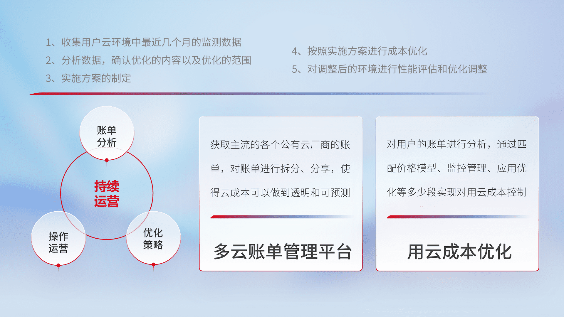 通过多云纳管,,以统一的资源数据模型把客户的云资源进行抽象和封装,,进而实现对多云资源的统一操作,,,,保障云资源管理的可靠性、、、稳定性与可用性。。。量身定制化运维内容,,,配置、、、开发运维、、、、补丁管理、、、备份、、监控、、、、认证和访问管理、、审计和日常巡检等,,,保障在用云过程中的可靠度,,,,稳定度以及高可用率。。。