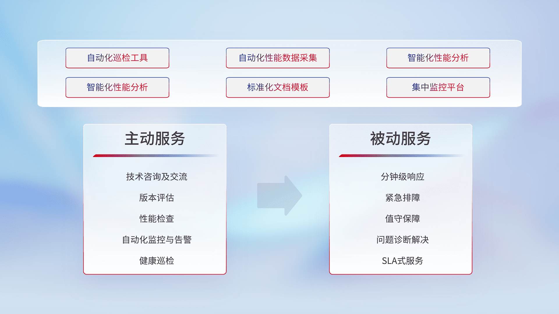 智能化工具和标准化文档,,,,保障服务质量,,提供主动服务(包含技术咨询、、、版本评估、、、性能检查、、自动化监控与告警、、健康巡检)和被动服务包含(分钟级响应、、紧急排障、、、、值守保障、、、问题诊断解决、、、、SLA服务)。。